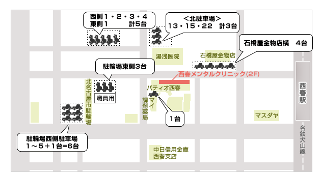 名草線(県道63号)西春駅交差点を東へ(右折)200m。中日信用金庫西春店向かい側。